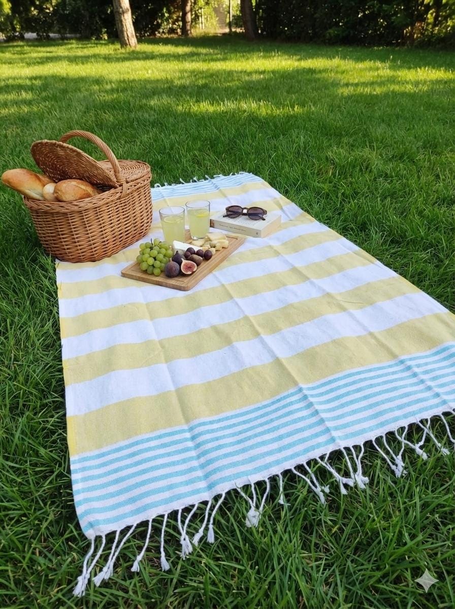 Meet your new favorite summer essential. This luxurious Turkish peshtemal towel features vibrant yellow wide stripes with delicate turquoise detailing at the hem, bringing the energy of the sun and sea together.